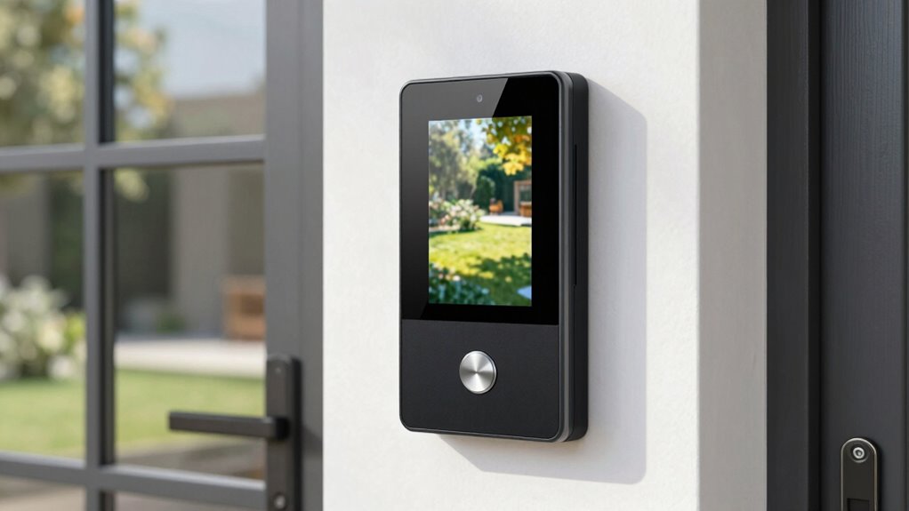Modern video intercoms include privacy features like video encryption and user authentication to guarantee your communication secure. Video encryption ensures your footage isn’t intercepted, while user authentication verifies authorized users only. These features work together to protect your privacy, giving you peace of mind when monitoring your front door. You can confidently upgrade, knowing your system prioritizes security and privacy with the latest technology.