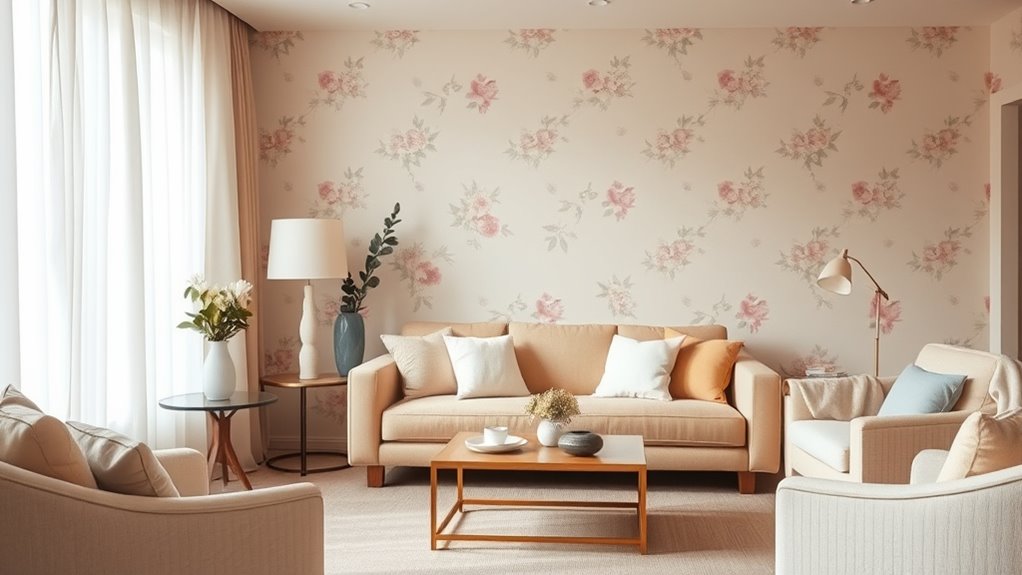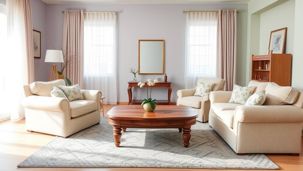 When selecting a color palette for senior-friendly spaces, opting for soothing and muted tones creates a calming environment that promotes relaxation and comfort. Decorating with pastels, such as soft blues, gentle greens, and light pinks, helps reduce visual stress and fosters a tranquil atmosphere. Choosing neutral tones like beige, taupe, or light gray adds warmth without overwhelming the senses. These subdued colors are easy on the eyes and can make a room feel more spacious and inviting. Stick to a limited palette to avoid overstimulation, and consider using these calming hues on walls, furniture, or accessories. Incorporating color psychology principles can further enhance the therapeutic effects of these color choices. The goal is to create a space that feels peaceful and secure, supporting a senior’s well-being through thoughtfully chosen colors. Additionally, cultivating a creative practice around decorating can lead to innovative ways to enhance comfort and safety in senior spaces. Incorporating sound design principles, such as gentle ambient sounds, can further promote a serene environment. Exploring the benefits of color therapy can also contribute to designing spaces that support emotional health and relaxation. As research on AI in healthcare advances, there are new opportunities to personalize and optimize color and sensory environments for individual well-being.