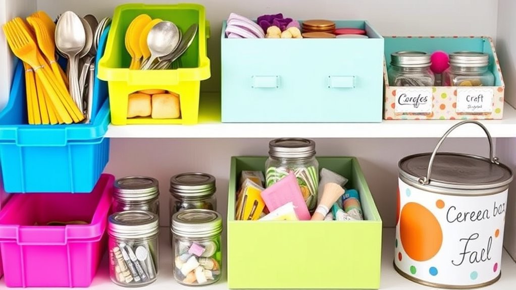 Imagine turning plain dollar store bins into treasures that reflect your personality. With simple customization tips, you can paint, label, or add washi tape for a pop of color. Use DIY decoration ideas like stickers or fabric to give them a unique touch. Personalizing your organizing items makes your space feel more inviting and truly yours, transforming ordinary finds into charming, functional pieces that tell your story.