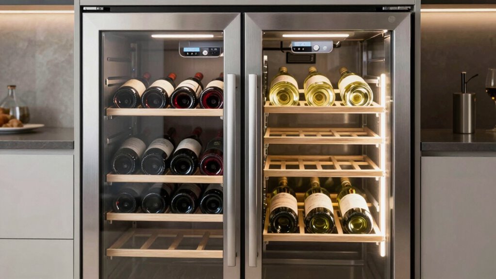 Dual-zone wine storage offers the significant advantage of maintaining different temperatures simultaneously, which is ideal if you keep both reds and whites. This temperature flexibility guarantees your wines are stored properly, preserving flavor and quality. Proper temperature management is crucial to prevent spoilage and ensure optimal aging conditions. It also allows for customized storage settings, catering to specific wine preferences and aging needs. However, this convenience comes with cost considerations. Dual-zone fridges tend to be more expensive upfront and may consume more energy, increasing your long-term electricity bills. Additionally, managing two temperature zones can be more complex, requiring careful calibration to prevent temperature fluctuations. If your collection is limited to a single wine type or you don’t need precise temperature control, a single-zone fridge might be more practical and cost-effective. Weigh these benefits against potential drawbacks to determine if dual-zone storage aligns with your wine habits and budget. Understanding the different types of wine storage can help you make an informed decision.