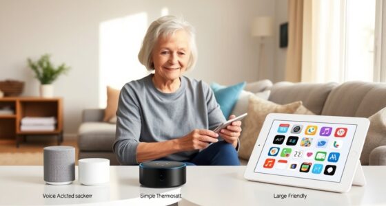 You can hide storage cleverly by using hidden compartments in furniture or opting for multifunctional pieces. For example, choose ottomans or beds with built-in storage, or install furniture with secret compartments to keep clutter concealed. These budget-friendly solutions maximize space without sacrificing style, making your room appear more organized and spacious. With a little creativity, you’ll find smart ways to hide storage and keep your space tidy.