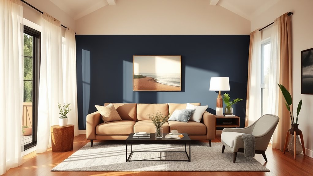 A cohesive color palette can dramatically transform your space by unifying different elements and creating a harmonious atmosphere. To achieve this, focus on color harmony—select colors that complement each other and support your desired mood setting. Light, neutral tones can make a room feel open and calm, while bold hues add energy and personality. Balance warm and cool shades to create depth and visual interest without overwhelming the senses. Use a primary color foundation and incorporate accent shades for contrast and variety. Keep in mind that lighting affects how colors appear; natural light enhances warmth, while artificial light can alter hues. By thoughtfully choosing your palette, you ensure your space feels intentional, inviting, and visually cohesive—all without breaking the bank.