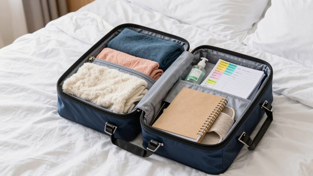 To personalize your hospital bag for your unique needs, use customization tips like packing favorite snacks or comfort items that soothe you. Include essential items tailored to your health or lifestyle, such as allergy medications or specific clothing. Focus on personalized packing by bringing items that make you feel most comfortable and secure, like a special blanket or music. This guarantees your hospital stay feels more familiar and supportive during this important time.