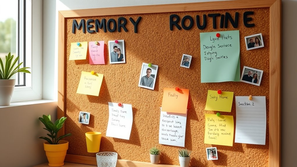 Creating a DIY daily routine center for loved ones is a great way to organize and celebrate special moments. Use a durable and attractive material like cork, wood, or a magnetic board to display photos, notes, and keepsakes. Design sections for routines, memories, or quotes, adding decorative touches that match your decor. Regular updates keep the space fresh and engaging. Keep exploring for tips to make your memory board a meaningful, interactive hub for daily life.