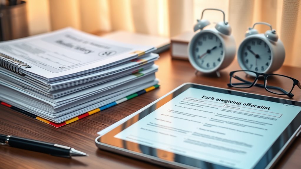 To be prepared as a caregiver, you should organize important documents like a power of attorney, healthcare directives, and a living will to guarantee medical decisions are respected. Keep medical records, medication lists, and emergency contacts handy for quick access. Also, gather financial papers such as wills, trusts, birth certificates, property titles, and insurance info to manage legal and financial matters smoothly. Continuing further helps you understand how each of these documents can safeguard your loved one’s well-being and future.