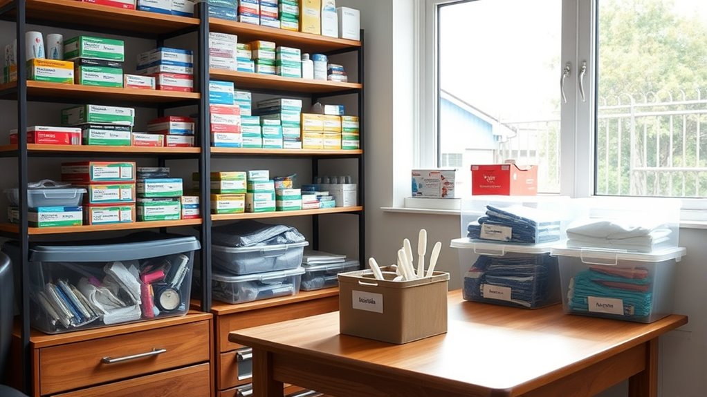 You should restock your medical supplies regularly based on your inventory management and supply tracking. Check expiration dates and usage patterns weekly to identify when items are running low. Create a schedule or routine, such as monthly reviews, to make certain you always have essentials on hand. This proactive approach helps prevent shortages, keeps your home organized, and ensures you’re prepared for any situation.