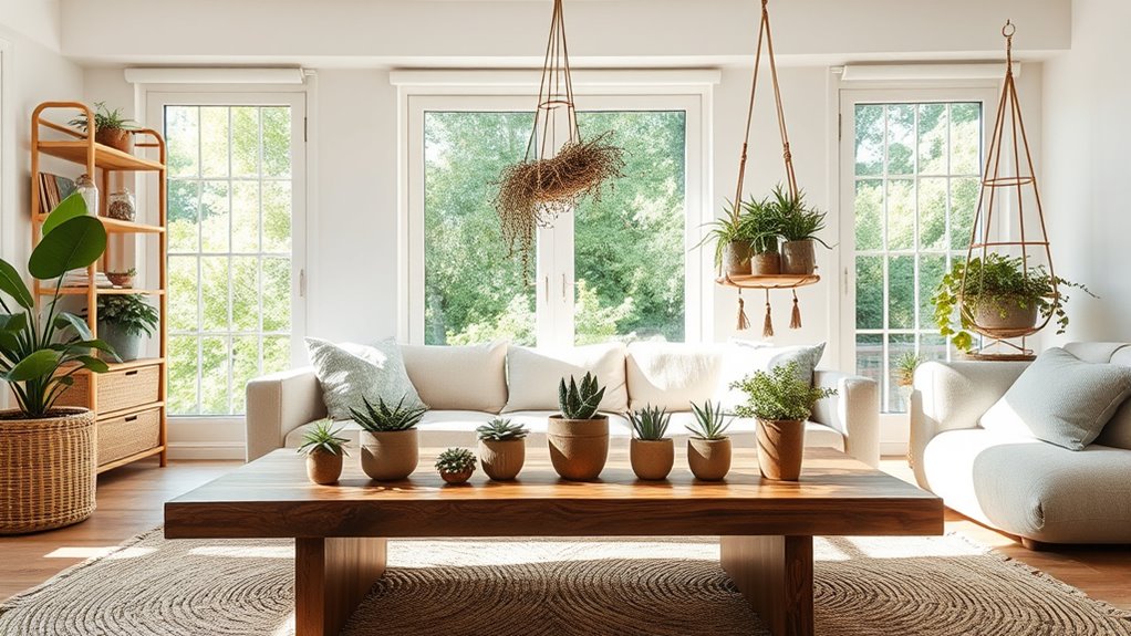 When you choose eco-chic decor, you help improve indoor air quality by reducing airborne pollutants and VOC emissions. Opting for natural materials, low-VOC paints, and sustainable furnishings means fewer harmful chemicals linger in your home. These choices not only make your space stylish but also healthier, as they decrease the presence of airborne pollutants that can cause allergies or respiratory issues. Your eco-friendly decor actively promotes a safer, cleaner environment indoors.