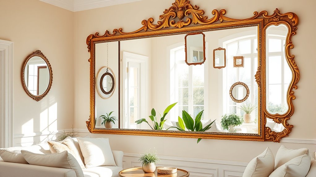Your choice of mirror frames considerably impacts your room’s aesthetics. Frame styles, from sleek modern to ornate vintage, set the tone and complement your decor. Decorative accents like intricate carvings or bold colors add personality and charm. By selecting frames that match your style, you enhance the overall look, making the space feel more curated and inviting. Keep in mind, well-chosen frames can turn a simple mirror into a focal point.