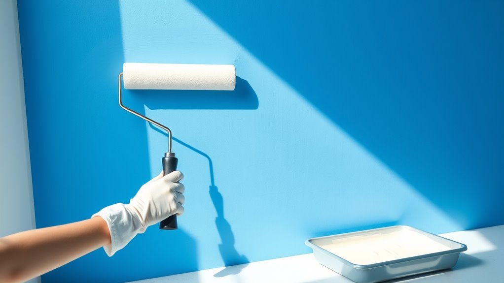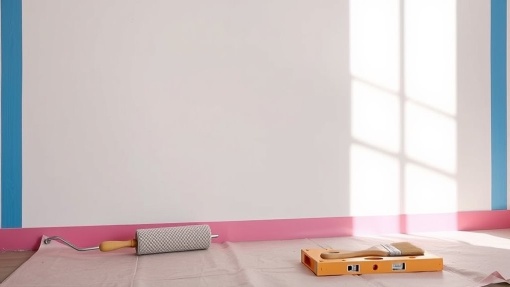 Before you start painting, clear the area so you have plenty of space to work. Next, clean your wall surfaces to remove dust and grease, ensuring the paint sticks well. Additionally, incorporating mindfulness techniques during preparation can help you stay focused and reduce stress. Practicing patience and attention to detail during this stage can lead to a more professional-looking finish. Engaging in preparation techniques that promote relaxation can also improve your overall painting experience. Incorporating proper surface preparation methods can enhance paint adhesion and durability. Finally, repair any imperfections like holes or cracks for a smooth, professional-looking finish. Incorporating long-lasting memories into your preparation can help you stay motivated and inspired throughout the painting process.