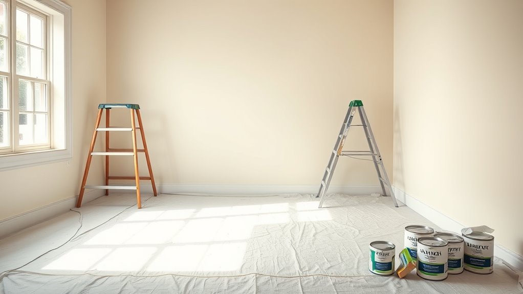 To guarantee your walls are ready for a smooth finish, start by clearing the area thoroughly. Begin with furniture removal to create enough space and prevent accidental damage. If you can’t move everything out, cover larger pieces with drop cloths and secure them in place. Next, focus on clutter organization by tidying up any small items, tools, or decorations that might get in your way. Clearing the floor and surrounding surfaces helps you access every wall easily and ensures a safer painting process. This step minimizes obstacles and reduces the risk of splatters or spills on valuables. Once the area is free of furniture and clutter, you’ll have a clear workspace that makes painting more efficient and results more professional-looking. Additionally, ensuring your walls are in good condition and properly prepared can prevent premature paint failure and enhance the longevity of your new paint.