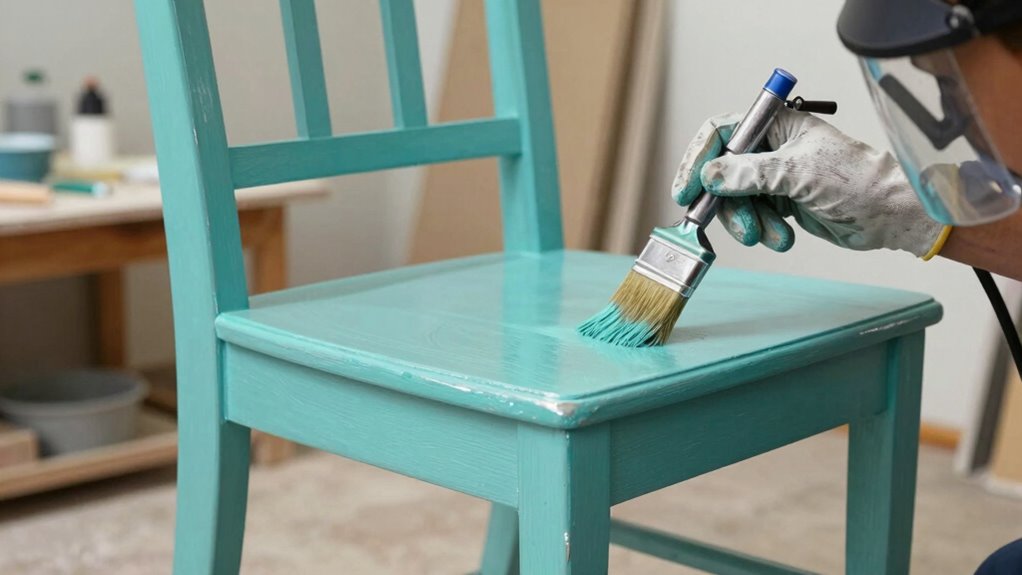 When painting furniture indoors, you should prioritize safety by using personal protective equipment like masks, gloves, and goggles. Make certain good ventilation by opening windows and using fans to disperse fumes, which reduces inhalation risks. Keep the workspace well-ventilated throughout the project, and take breaks to breathe fresh air. These ventilation tips and protective gear help you paint safely and achieve a durable, professional finish.
