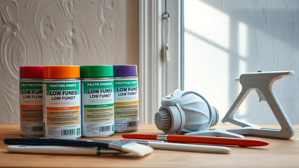 You can guarantee child and pet safety by choosing low-fume paints, which emit fewer harmful chemicals. Keep children and pets away from freshly painted areas until the paint fully dries and ventilates. Always read manufacturer instructions and opt for paints labeled safe for indoor use. This proactive approach minimizes exposure, protecting your loved ones’ health and creating a safer environment for everyone in your home.
