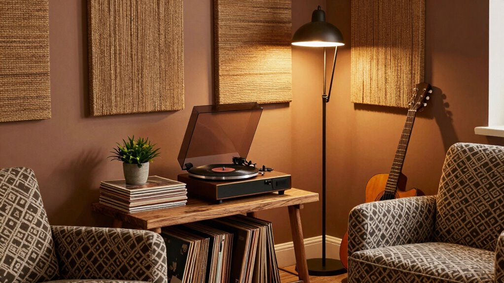 Alongside soundproof curtains, acoustic panels play an essential role in controlling sound within the room. Instead of large, industrial-looking panels, opt for designs that double as wall art. There are many options now that resemble decorative elements—geometric shapes, textured fabrics, or even framed artwork—that help absorb sound while adding personality to your space. Position these panels strategically around your listening or practicing area, especially on walls facing noisy streets or shared walls, to reduce echo and improve clarity. The key is to place them where sound tends to bounce or reflect, creating a balanced acoustic environment without sacrificing style. Additionally, understanding sound absorption techniques can help you optimize the placement of these panels for maximum benefit.