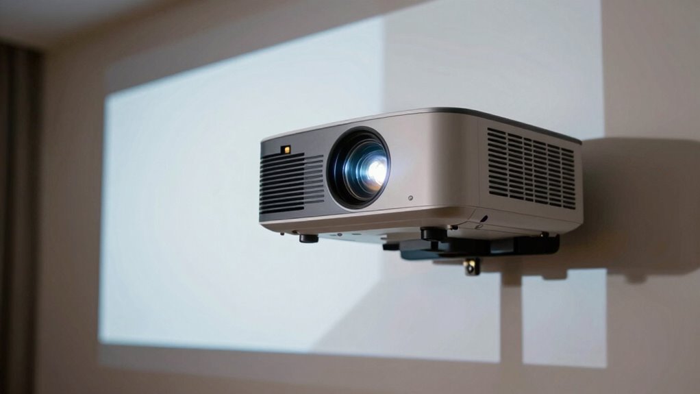 You might be surprised, but the best wall colors for projector projection are matte, neutral shades like light gray or beige. These minimize reflections and enhance contrast. Keep in mind, wall texture matters too—smooth surfaces help with accurate projector calibration, avoiding distortions. Avoid glossy or dark walls, as they can absorb or scatter light, reducing image clarity. Choosing the right wall color and texture makes your viewing experience sharp and immersive.
