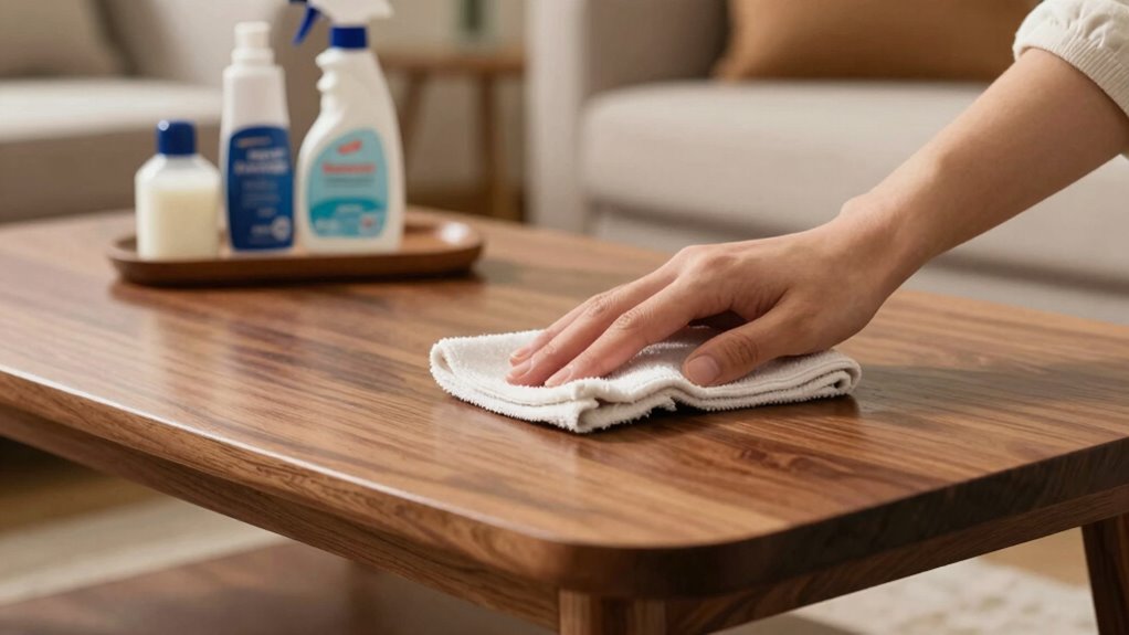 Gathering the right supplies is the first step to a quick and effective furniture maintenance routine. You want to guarantee you have everything needed for proper furniture cleaning and upkeep. Grab a soft microfiber cloth to avoid scratches, a gentle furniture cleaner suitable for your piece, and a small container of furniture polish or conditioner if needed. Having these items ready helps you stick to your maintenance schedule without delays. Avoid using harsh chemicals or abrasive tools that could damage your furniture’s finish. Keep your supplies within arm’s reach, so you can quickly wipe down surfaces and prevent dirt buildup. Preparing your supplies beforehand makes your 5-minute routine seamless and ensures your furniture stays looking fresh and well-maintained over time. Understanding furniture finishes can help you select the most suitable cleaning products for your pieces.