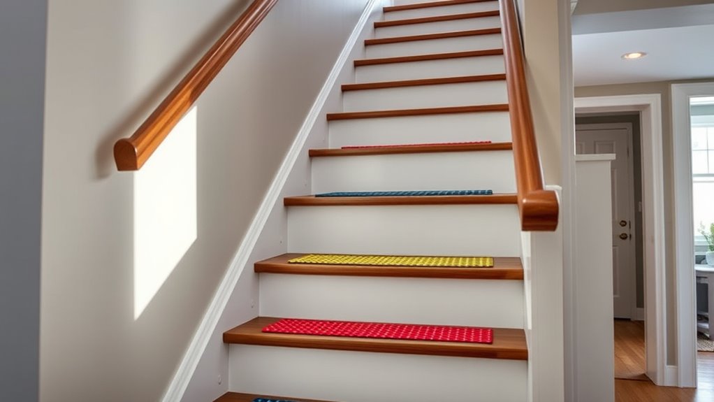 To reduce the risk of falls on stairs, it’s essential to prioritize safety measures that keep everyone secure. Start by examining your staircase design; ensure steps are uniform in height and depth to prevent tripping. Next, choose sturdy railing materials like wood or metal that provide reliable support. Consider these safety enhancements: 1. Install a continuous handrail on both sides of the staircase for better grip. 2. Use non-slip treads or rugs to add traction. 3. Ensure adequate lighting above and along the staircase. 4. Regularly inspect and tighten railing fittings to prevent wobbling. Additionally, incorporating self-watering planter pots into your home decor can promote safer indoor environments by reducing maintenance and potential hazards. Maintaining a clutter-free stairway and considering bathroom safety features can further enhance overall safety in your home.