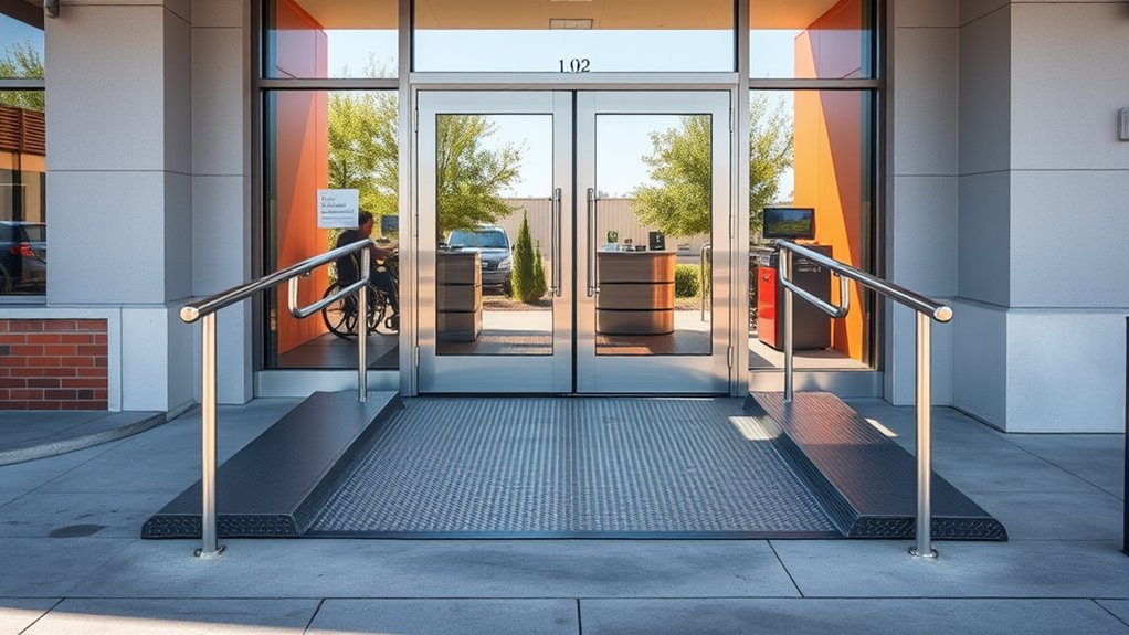 To guarantee your design complies with ADA standards, you should incorporate accessible fixtures like wider doors and ramps, and prioritize safety considerations. Check ADA guidelines for specific measurements and requirements, and consult with a professional architect or accessibility expert. They’ll help you verify that your plans meet all regulations, ensuring safety and accessibility for wheelchair users. Regularly review local codes, as they may have additional or updated standards.
