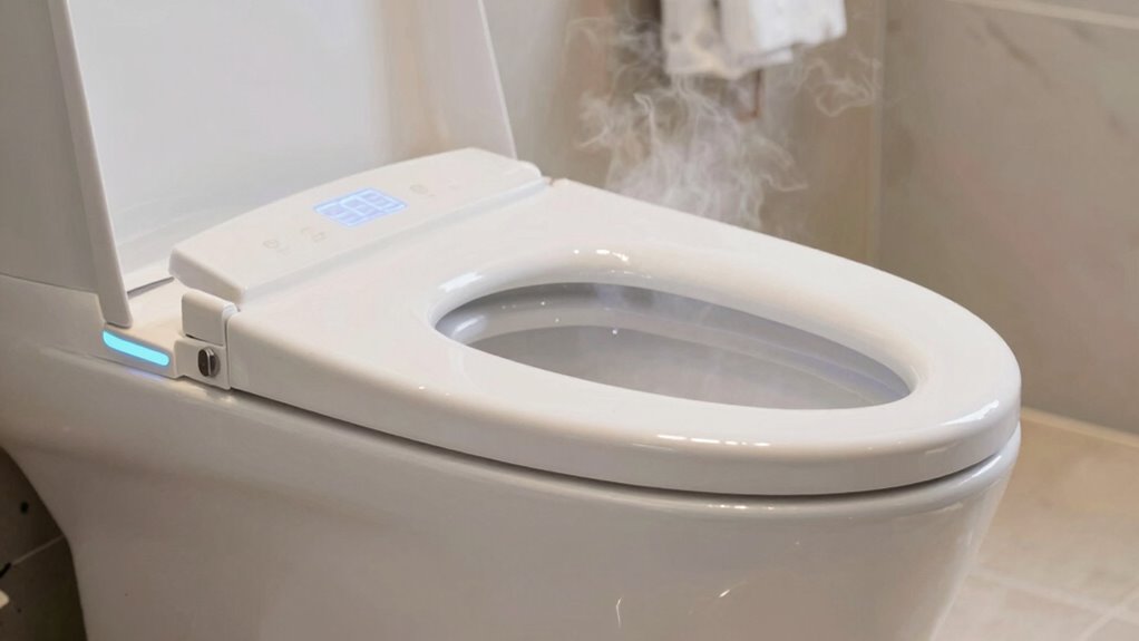 Heated bidet seats can be suitable for many seniors, but you should consider their needs for elderly independence and bathroom safety. If they struggle with mobility or balance, look for models with easy controls and secure installation. These seats can boost comfort and hygiene, but always guarantee they’re user-friendly and safe for the individual. Consult a healthcare professional if you’re unsure whether a heated bidet seat fits your loved one’s specific needs.