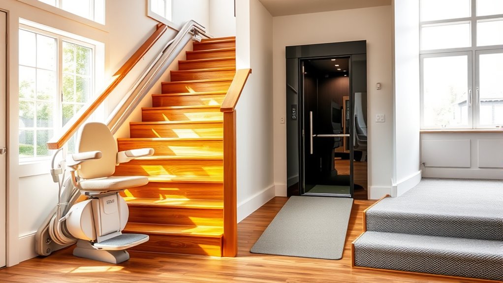 You’ll find that each mobility option includes standard safety features. Stairlifts often have emergency stop buttons, seat belts, and swivel seats for safety and accessibility standards. Home elevators typically come with alarm systems, door sensors, and emergency communication devices. Ramps are built with sturdy handrails and slip-resistant surfaces to meet accessibility standards. These features guarantee you’re protected and can use each solution confidently in case of emergencies.