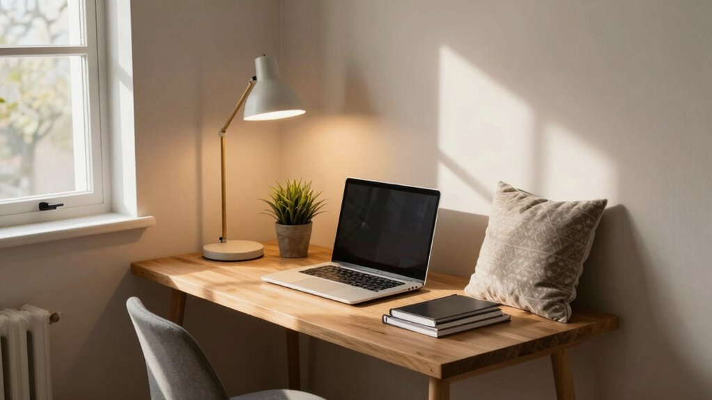 To make your study nook feel brighter and more inviting, start by maximizing natural light through strategic window placement or sheer curtains. Layer your lighting with a mix of overhead, task, and accent lights to eliminate shadows and create a balanced glow. Opt for bright, warm bulbs to enhance comfort and focus, making your small space feel open and cozy at the same time.