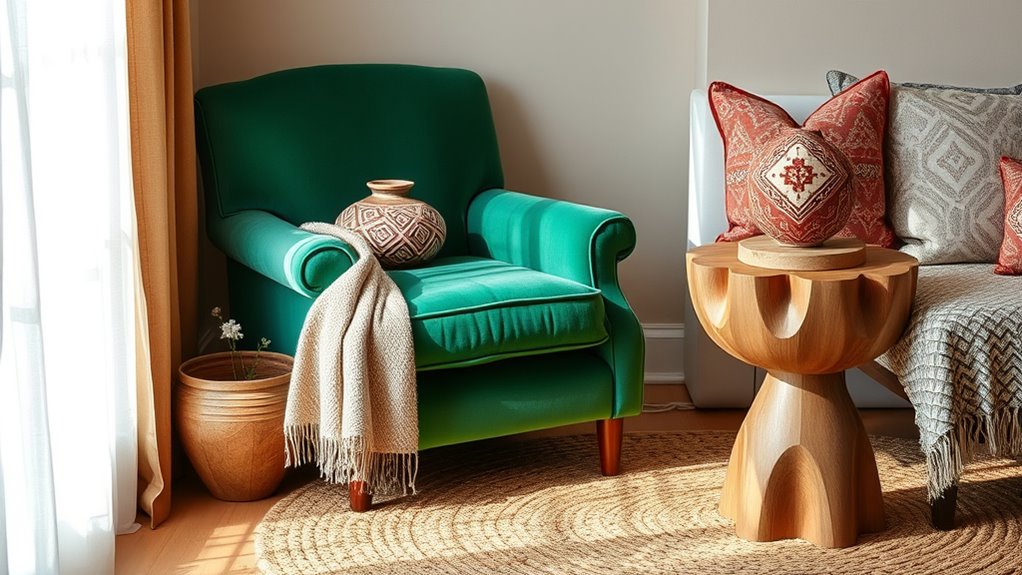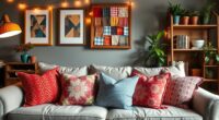 Adding texture and pattern can transform a plain space into one full of visual interest and depth. You can achieve this through fabric layering—combining different textiles like throw pillows, rugs, and curtains to add tactile appeal. Mixing patterns, such as stripes with florals or geometric shapes with organic designs, creates dynamic visual interest. To balance bold choices, keep color palettes cohesive. Here’s a simple idea table: