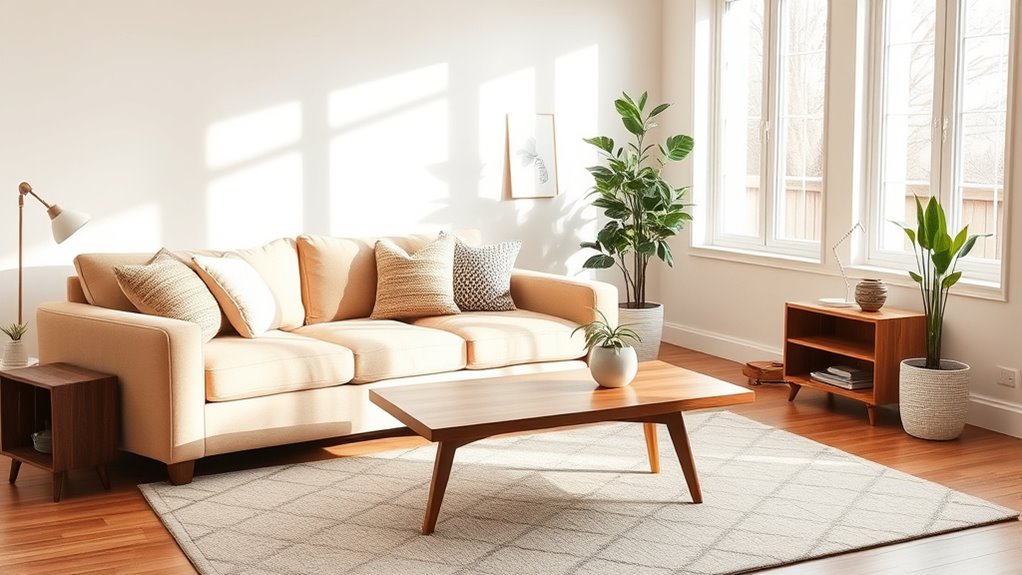 Before selecting furniture, it’s essential to measure your room dimensions accurately. Use a tape measure to record the length, width, and ceiling height. Pay attention to wall placement, noting locations of doors, windows, and electrical outlets, as these affect furniture placement. Proper measurements help you choose pieces that fit without overcrowding the space. Additionally, consider room acoustics; larger or oddly shaped rooms can cause sound issues, so plan for furniture placement that minimizes echo and noise. Sketch a layout with your measurements before shopping, ensuring each piece complements the room’s size and shape. Accurate measurements prevent buying furniture that’s too big or too small, making your space functional and comfortable. This step is vital for achieving a balanced, well-styled home. Proper measurements also influence the choice of vacuum cleaner attachments, ensuring they are suitable for cleaning the entire space effectively. Understanding technology in energy distribution, such as AI-driven smart grids, can inspire you to incorporate smart home features that optimize energy use and enhance your living environment. Additionally, researching Gold IRA options can help you diversify your investment portfolio in preparation for future financial stability. A thorough understanding of projector bulb maintenance can also help preserve your home entertainment setup, ensuring longevity and optimal performance. Incorporating self-watering plant pots into your decor can add greenery effortlessly while maintaining healthy plants with minimal effort.