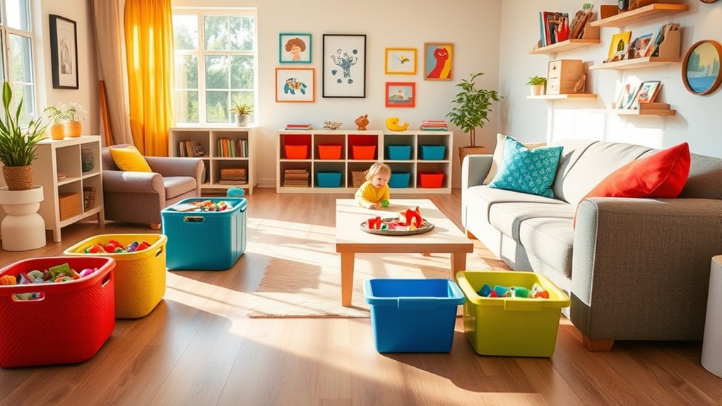 Creating a kid-proof home doesn’t mean sacrificing style; instead, it’s about thoughtfully choosing durable materials and safe design solutions. When it comes to playroom organization, your goal should be to create a space that’s both fun and functional while minimizing clutter. Start by selecting storage solutions that are easy for kids to access and put away, like low shelves, baskets, or cubbies. Use clear containers to help your children identify their toys quickly, and consider labeling bins for easy cleanup. Keeping the play area tidy not only encourages responsibility but also guarantees safety by reducing tripping hazards.
