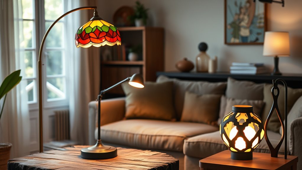 Adding unique lamps is a fantastic way to give your room personality and charm. Consider sculptural or vintage-inspired designs that double as art pieces, or minimalist geometric styles for a modern touch. Mix materials like metal, glass, and wood for textured interest, and explore smart, adjustable options for function and convenience. These thoughtful choices can transform your space from ordinary to extraordinary—keep exploring to discover more ideas that will truly make your decor stand out.