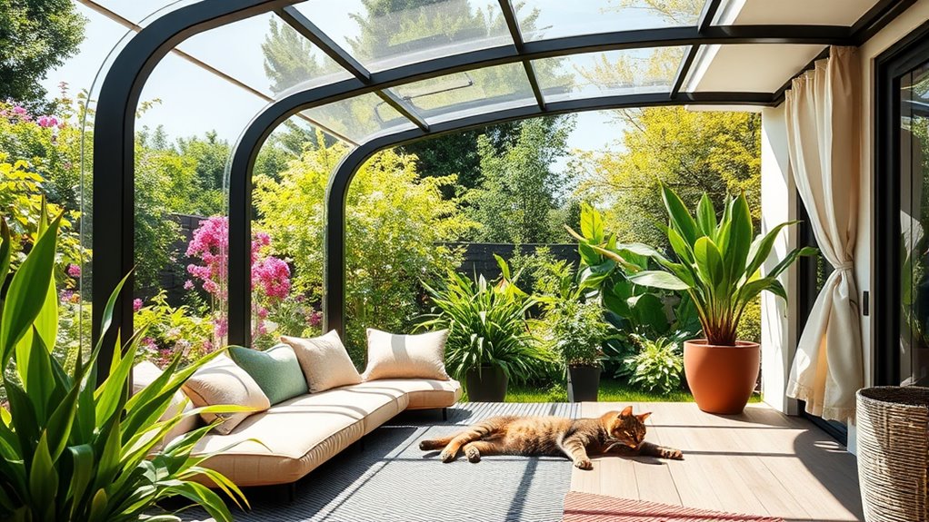 To guarantee your outdoor space remains safe and enriching over time, regularly inspect for wear and tear. Check fencing, furniture, and enrichment features for damage, and clean the area to prevent pests. Creating a balanced outdoor environment that emphasizes indoor enrichment and outdoor safety not only enhances your pet’s quality of life but also gives you peace of mind. When you thoughtfully design your patio with both style and security in mind, you turn it into a true haven for your furry friends—an inviting, safe, and stimulating outdoor retreat.