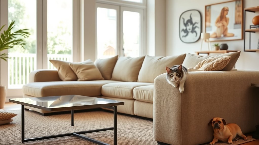 Opting for these fabrics helps keep your space clean and stylish. Combining pet hair camouflage with scratching deterrents ensures your furniture remains inviting and damage-free despite furry friends.