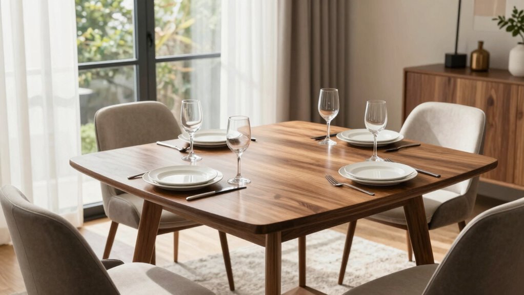 In small rooms, a round or oval table works best, maximizing space and promoting easy movement. Material options like wood or glass add style, with wood offering warmth and durability, while glass creates an open feel. Consider style considerations such as modern or traditional, and choose a shape that fits your space without overcrowding. These choices guarantee your small room remains functional and stylish, making mealtime more comfortable.