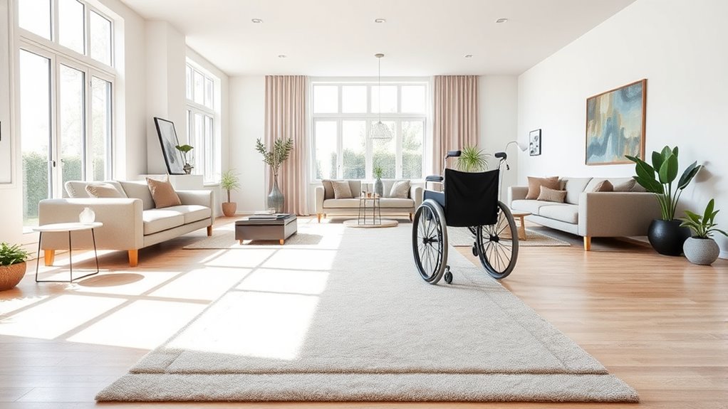 To create a living room that’s easy to walk through and wheelchair-friendly, start by evaluating your current setup and removing obstacles. Arrange furniture against walls to keep pathways clear, choosing slim or multifunctional pieces that don’t clutter space. Define zones with rugs and ensure good lighting along walkways. Keep cords and items off the floor, and regularly review your layout for improvements. Continue exploring for more tips on making your space fully accessible.