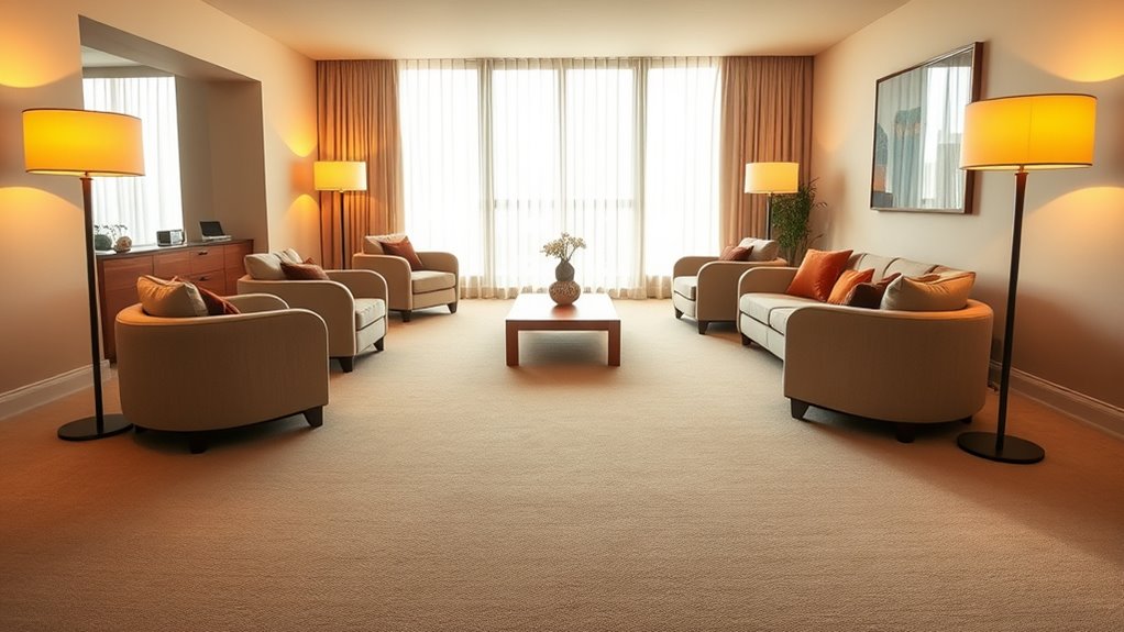 To guarantee your living room feels open and easy to navigate, arranging seating to maximize clear circulation areas is essential. Focus on furniture placement that encourages smooth traffic flow, preventing congestion in walkways. Position sofas and chairs against walls or in a manner that leaves wide pathways through the center of the room. Avoid cluttering the space with bulky furniture that narrows pathways. Keep at least 36 inches of clearance around main seating areas so you or a wheelchair can pass easily. Consider the natural flow of movement when arranging furniture, ensuring that pathways remain unobstructed. Incorporating ergonomic layout principles can further enhance accessibility and comfort. Additionally, evaluating space planning strategies can optimize room functionality and safety. Incorporating weather-resistant outdoor furniture in transitional spaces can also enhance safety and durability. This approach not only enhances safety but also creates a welcoming, functional space that’s easy to navigate for everyone. For optimal comfort and safety, selecting furniture with energy-efficient features can contribute to a more sustainable living environment. Implementing smart home technology can also facilitate easier movement and control within the space, especially for those with mobility challenges.