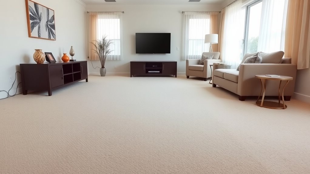 Using rugs and flooring strategically can help define different zones within your living room without adding clutter. Area rugs can visually separate seating areas from walkways, making navigation easier. Choosing the right flooring materials, like smooth hardwood or low-pile carpet, creates a seamless surface that’s safe and accessible. By carefully selecting and placing rugs, you can delineate spaces without bulky furniture or walls. Consider these tips: