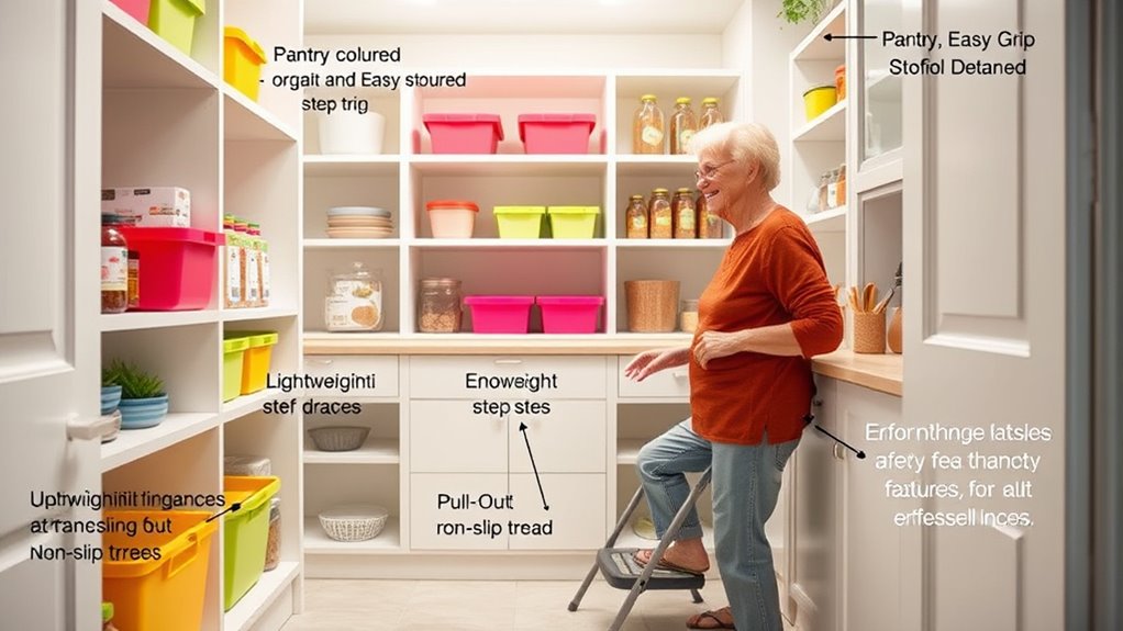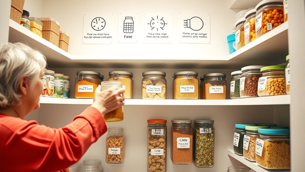 Clear labels and signage are essential for making storage areas easy to navigate. You should use color coded labels to quickly identify different categories, such as blue for cleaning supplies or green for kitchen items. This visual cue helps seniors recognize storage locations at a glance. Additionally, tactile signage is a great option for those with visual impairments; raised symbols or textured labels allow fingertip identification. Keep labels large and legible with high contrast lettering to improve visibility. Place signs at eye level or within easy reach, ensuring they’re clearly visible from multiple angles. Consistent labeling across storage areas creates a predictable system, reducing confusion. Incorporating these strategies makes accessing household items faster and safer for seniors with limited mobility.