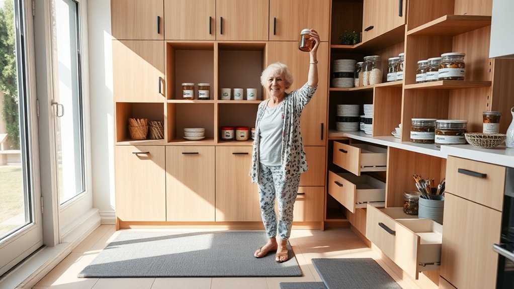Ever wondered how to make your home safer for seniors? You should prioritize ergonomic design and safety features in storage solutions. Install drawers with soft-close mechanisms, avoid sharp edges, and guarantee items are within easy reach to prevent falls or injuries. Do you really want clutter to become a hazard? Using these safety considerations helps create a secure environment where seniors can move confidently and independently.