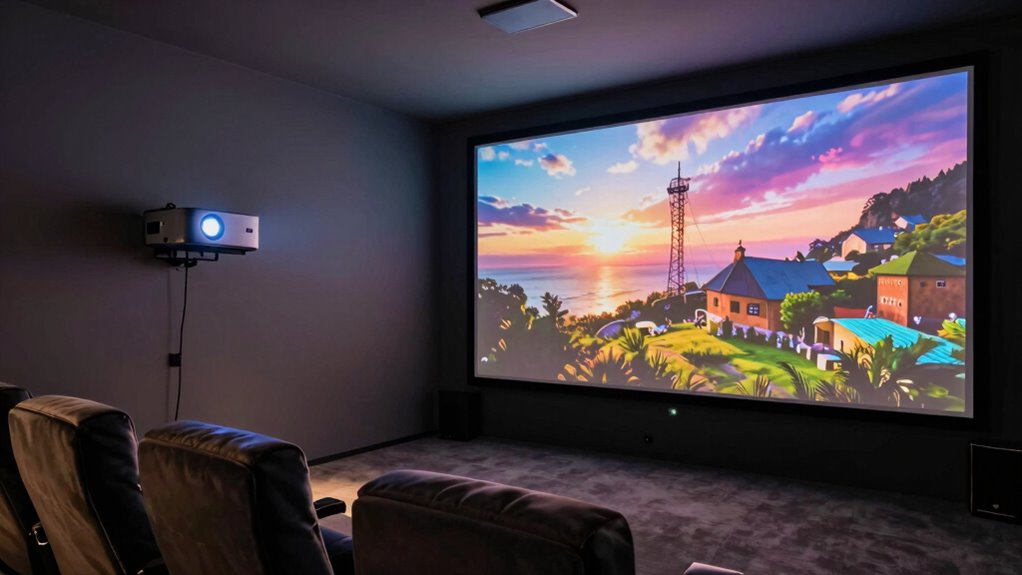 Latency can be a concern with 4K projectors for gaming, but many modern models have low input lag, often under 20 milliseconds, making gameplay smooth and responsive. I recommend checking the specs for each projector, as some are specifically designed to minimize delay. If you’re serious about gaming, look for projectors labeled as gaming or with low latency features to guarantee the best experience.
