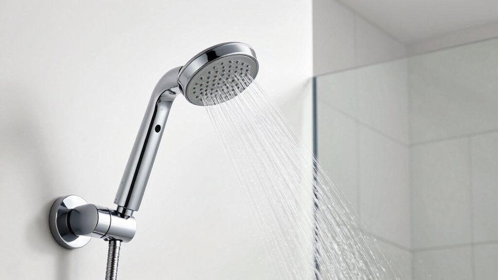The adjustable range and flexibility of a shower head play a critical role in guaranteeing a comfortable shower experience for everyone. Typically, the adjustable height varies from 20 to 28 inches, accommodating users of different heights, including children and seated users. Flexibility often includes tilting angles of up to 30 degrees or more, allowing targeted water flow where needed. A wider range ensures everyone gets a comfortable shower, no matter their stature. Ease of adjustment is essential, so look for features like sliding brackets, lock screws, or ball joints that make repositioning smooth and effortless. Durable materials like stainless steel or brass help maintain stability and prevent sagging during adjustments, ensuring your shower head stays securely in place over time.