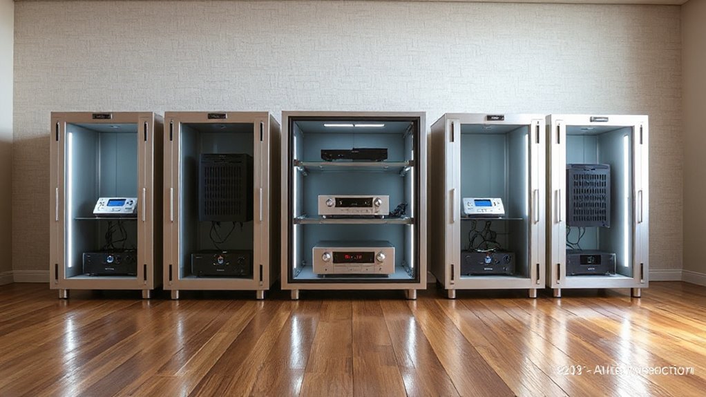 When considering airflow customization options for a ventilated AV receiver cabinet, it’s important to look at features that give you control over cooling performance. Adjustable ventilation systems let you set airflow levels based on your equipment’s temperature and workload, ensuring superior cooling. Some cabinets have programmable fans with thermal trigger modes, activating automatically when temperatures rise too high. Multiple fan speed settings offer flexibility to balance cooling efficiency and noise levels, giving you more control. Modular or customizable vent openings allow you to tailor airflow pathways to your specific setup, improving overall ventilation. Additionally, fan controllers with digital displays enable precise adjustment of airflow rates, helping you maintain the ideal operating environment for your AV gear without guesswork.