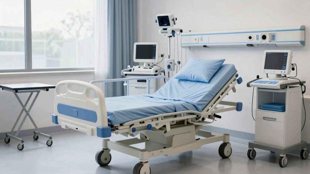 Choosing a bariatric electric hospital bed requires careful attention to accessory compatibility to guarantee it meets all patient needs. I look for beds that work seamlessly with standard safety and support accessories like safety rails, IV poles, and side rails. It’s essential that the bed’s frame and mounting points support a variety of accessories from different manufacturers, ensuring flexibility. I also verify that attachment mechanisms are secure, capable of handling the weight and pressure of bariatric patients without slipping or damage. Compatibility with pressure relief surfaces, support cushions, and specialized hospital equipment is vital for patient comfort and safety. Lastly, I prefer beds that allow quick, tool-less attachment and removal of accessories, making maintenance and customization simple and efficient.
