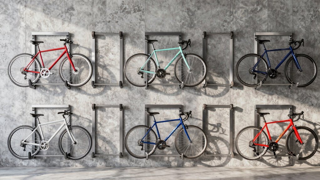Imagine hanging a sturdy, reliable companion on your wall; that’s what these racks aim to be. Usually, they support between 33 to 66 pounds, depending on the model and mounting surface. I recommend checking each product’s specifications to guarantee it matches your bike’s weight. For heavier bikes or multiple bikes, opting for a reinforced or heavy-duty rack is a smart move.