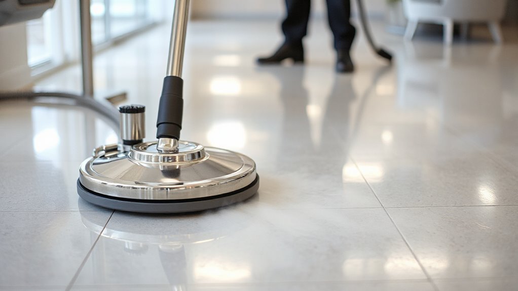 When selecting a commercial steam cleaner for floors, I focus on key factors like power and steam output to guarantee effective cleaning. I also consider tank capacity for longer runtimes, along with versatility and attachments for different surfaces. Safety features and ease of use are equally important to make sure the cleaner fits my needs and keeps everyone safe.