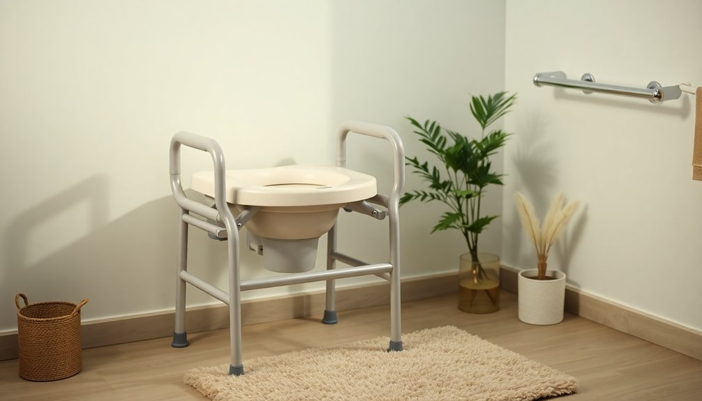 Choosing the right commode can greatly enhance safety and independence for the elderly and disabled, especially when it includes features like FSA/HSA eligible adjustable toilet safety rails. These rails provide essential support, making it easier for users to sit and stand safely. With a weight capacity of 300 pounds and adjustable height and width, they fit various body shapes and toilets. The sturdy, corrosion-resistant aluminum frame guarantees reliability, while the non-slip foam grips enhance security. Plus, they're easy to assemble and fold for storage or travel. I've seen many users express satisfaction with their stability and comfort.
