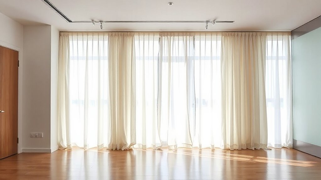 When choosing a curtain track system for a room divider, I consider factors like track material durability and how easy it is to install. I also look at the design flexibility, load capacity, and whether it’s compatible with the curtains I want to use. These points help guarantee I pick a system that’s functional, sturdy, and suits my style.