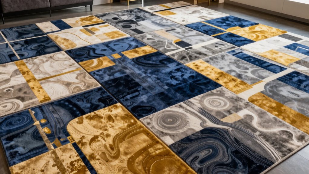 Imagine a splash of color dancing across your floor—that’s how I choose an abstract rug to complement modern interiors. I look for pieces with bold, yet balanced designs that echo my space’s color palette and sleek lines. I also consider texture and scale, ensuring the rug enhances rather than overwhelms. This way, it becomes a statement piece that ties my room’s contemporary vibe together seamlessly.