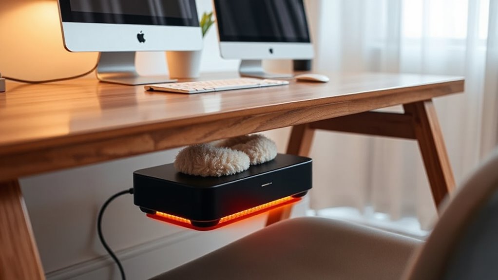 I can tell you that most under desk foot warmers operate quietly, making them perfect for work or study environments. They usually emit minimal noise, often just a gentle hum or slight clicking when turning on or adjusting settings. I personally find them unobtrusive, so I can focus without distractions. If noise is a concern, I recommend checking product reviews—many users mention how silently these heaters work.