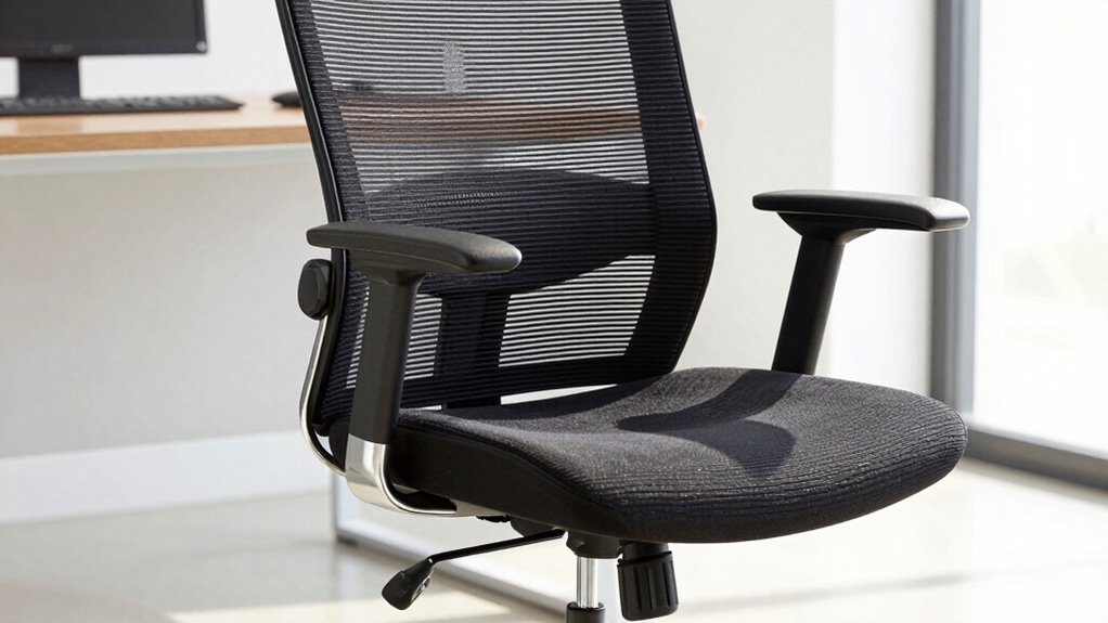 When selecting an ergonomic office chair with a high back mesh, seat comfort and padding play a crucial role in guaranteeing all-day support. Adequate padding and high-density foam in the seat cushion help keep you comfortable during long hours. Thick, soft padding distributes pressure evenly, reducing fatigue and discomfort. Breathable mesh seats combined with supportive padding improve airflow, preventing heat buildup and keeping you cool. Many ergonomic high back mesh chairs offer adjustable lumbar and seat padding, allowing you to customize support for your body. Properly cushioned seats with ergonomic contours promote healthy posture and lessen strain on your hips and thighs. Prioritizing quality padding and comfort features ensures you stay comfortable, focused, and productive throughout your workday.