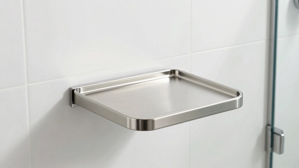 Choosing a fold-down shower seat that lasts requires attention to the materials it’s made from. High-quality options like stainless steel, teak, or phenolic resin are essential because they resist moisture, corrosion, and wear, ensuring longevity. Materials such as Grade-A teak and 304 stainless steel can support weight capacities of up to 450 lbs while maintaining their structural integrity over time. Water-resistant coatings like waterproof varnish and anti-slip finishes further protect against humidity and water damage. The right material choice also affects maintenance: non-porous, durable surfaces are easier to clean and less prone to mold, mildew, or staining. Overall, selecting sturdy, high-quality materials guarantees a stable, secure, and safe seat that withstands daily use without deterioration.