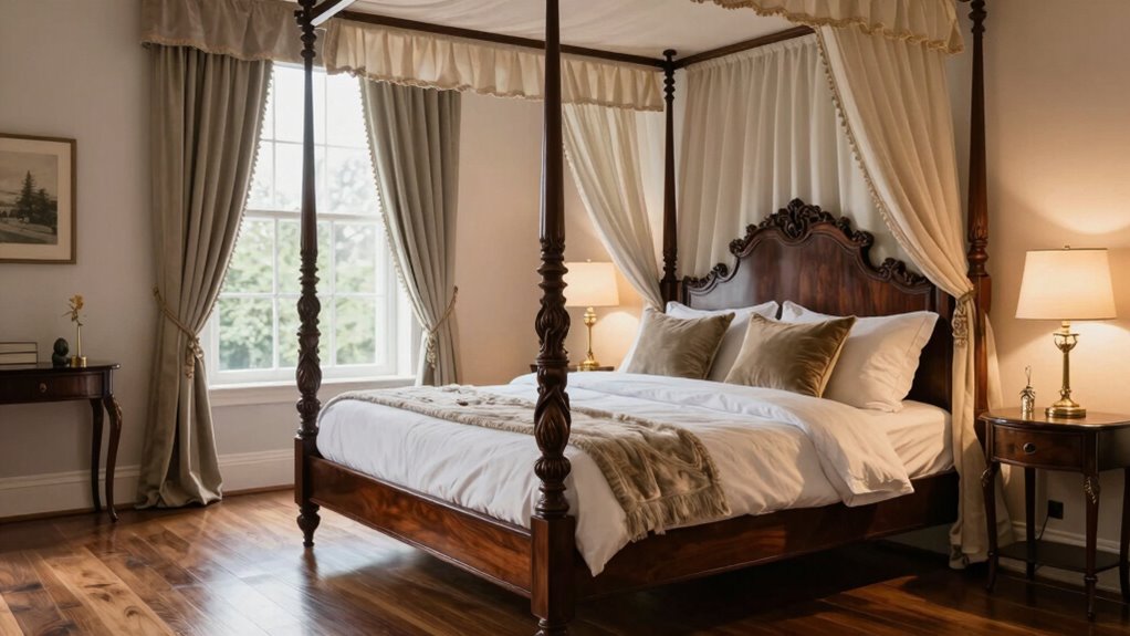 A sturdy mattress support system is essential for maintaining the integrity and comfort of your king-sized four poster bed. It guarantees even weight distribution, preventing sagging and extending your mattress’s lifespan. The support should include solid slats or a platform that can handle the weight of both the mattress and sleepers without warping or collapsing. Proper support also minimizes movement transfer and noise, creating a quieter, more restful sleep environment. Since many four-poster king beds accommodate various mattress types—like memory foam, latex, or springs—compatibility is key. A well-designed support system eliminates the need for additional foundations or box springs, simplifying setup and boosting stability. Ultimately, your mattress support system is the foundation of a comfortable, durable, and noise-free sleeping experience.