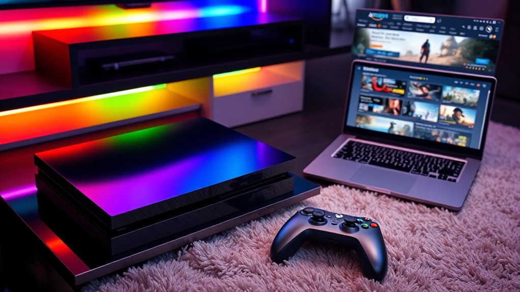 After verifying a gaming console is compatible with various accessories, I turn my attention to performance specifications. I look for consoles with at least 10GB of RAM; this supports smooth multitasking and faster load times during gameplay. The processor matters too—options like 1.5GHz 64-bit or AMD Ryzen 9 can greatly boost performance and graphics. I also check for SSD storage; consoles with 512GB or larger provide quicker game access and reduced loading times. Don't forget the GPU! A powerful option like the NVIDIA GeForce RTX 4070 Ti guarantees compatibility with high-resolution gaming. Finally, I make sure the console supports HDR and 4K output for stunning visuals and a truly immersive experience.